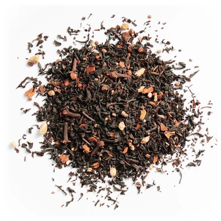 Schwarztee-/Gewürzmischung. Die harmonische Kombination von Ingwer, Zimt, Nelken und Kardamom verleiht diesem Chai eine komplexe Tiefe und angenehme Wärme, die sich perfekt mit dem robusten Geschmack des Schwarztees verbindet. Ein reichhaltiges Geschmackserlebnis mit würziger Exotik und pfeffriger Kardamomnote.
